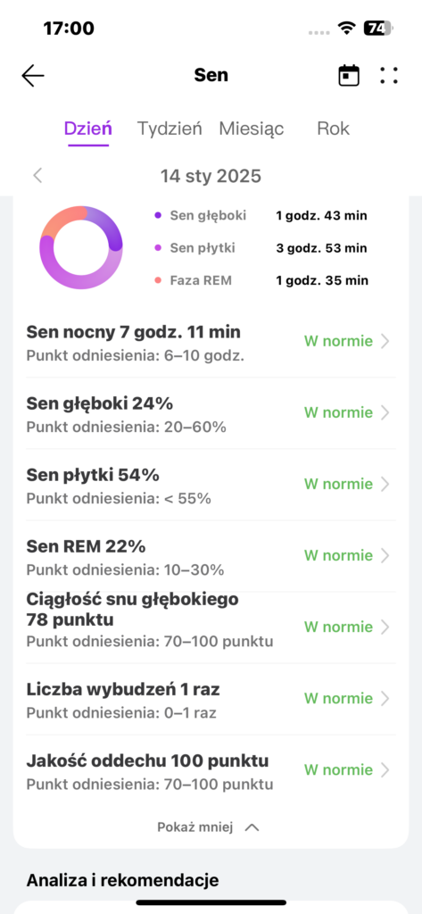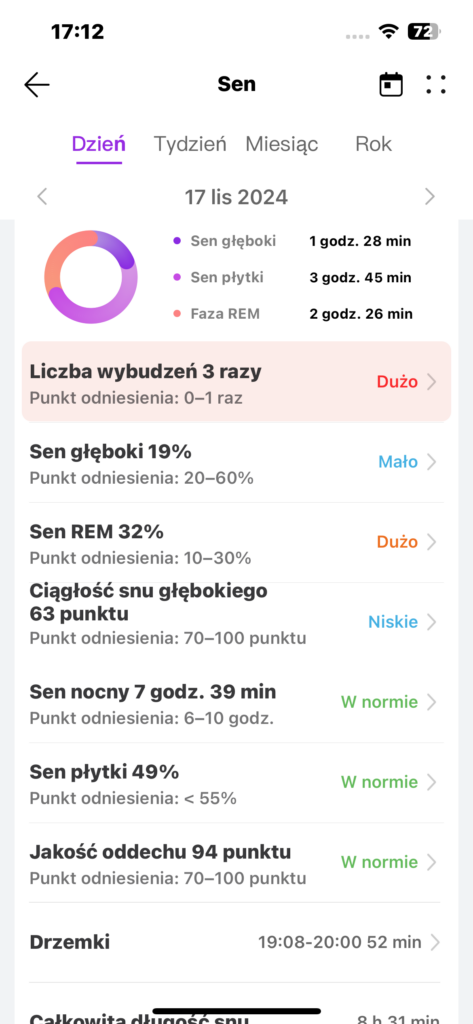 Na pierwszym zrzucie widzicie mój przeciętny sen w 2024 roku. Choć wszystkie powyższe zmiany wprowadzałem nierównolegle to od Świąt Bożego Narodzenia staram się pilnować każdej z nich i każda z nich działa już od świąt codziennie i o to efekt. Poprawa ciągłości snu głębokiego oraz zwiększenie jego ilości. Ma to nieocenione przełożenie na funkcjonowanie w ciągu dnia.